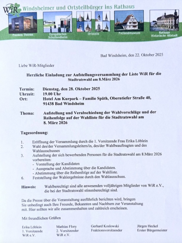 Die Vorstandswahlen unter der Leitung von Karin Schulenburg brachten eine Änderung an der Spitze: Stadträtin Erika Löblein wurde einstimmig zur ersten Vorsitzenden gewählt. Ihr Stellvertreter bleibt Matthias Flory, Schatzmeister ist weiterhin Hartlef Koch ebenso wie Schriftführerin Bianca Hartung. Neu in den Vorstand kamen Dr. Benno Bulitta und Fabian Temme als Medien- und Presse-Beauftragte. Alle weiteren WiR-Stadträte (Dr. Wolfgang Stadtler, Gerhard Koslowski, Dr. Isabell Heckel) sowie Bürgermeister Jürgen Heckel sind ebenfalls Vorstandsmitglieder.